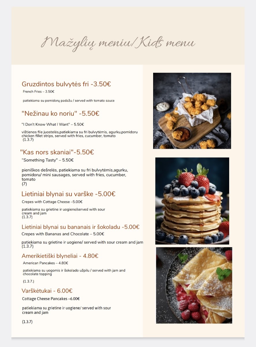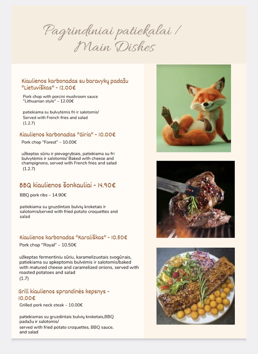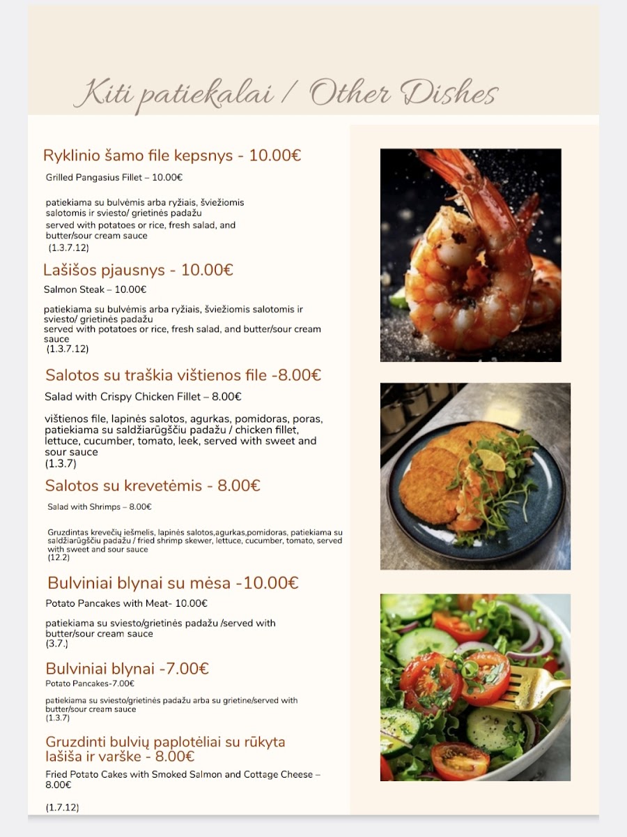 Welcome to Soti Lapė, a delightful cafeteria nestled in the heart of Gargždai, Lithuania. This charming spot offers an eclectic menu that caters to all tastes, featuring a variety of dishes including snacks, options for youth and children, and succulent chicken and pork meals. Each dish is generously portioned, ensuring you leave satisfied!